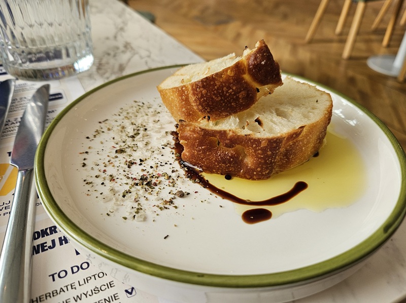Restauracja Insieme powitała nas jasnym, przestronnym wnętrzem. Kiedy kelner przyniósł czekadełko w postaci przepysznej foccacii, z niecierpliwością czekaliśmy na dalsze kulinarne doświadczenia.