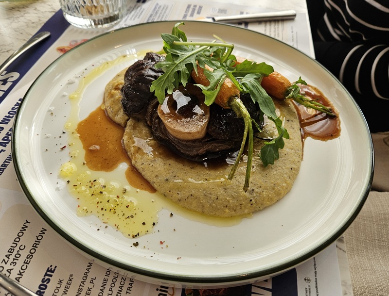 Danie główne, wołowe ossobuco z pieczoną marchewką, polentą z truflą i sosem szałwiowym, zapowiadało się naprawdę interesująco. Mieliśmy nosa - danie okazało się pokazem włoskiej klasyki w nowoczesnym wydaniu. Mięso rozpływało się w ustach, a truflowa polenta była smacznym dodatkiem.