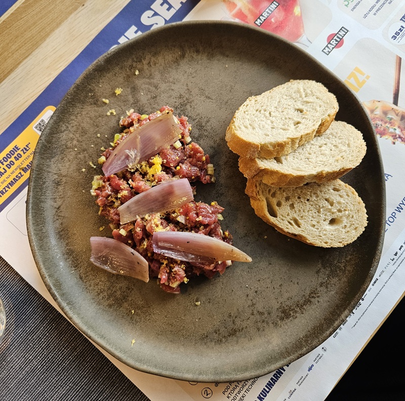 Menu A rozpoczęło się tatarem wołowym z dodatkiem suszonego żółtka, szalotki, musztardy francuskiej, majonezu szczypiorkowego i piklowanej cebulki. Przystawka była dobrze skomponowana, z wyraźnie zaznaczonym balansem między kwasowością a kremowością dodatków.