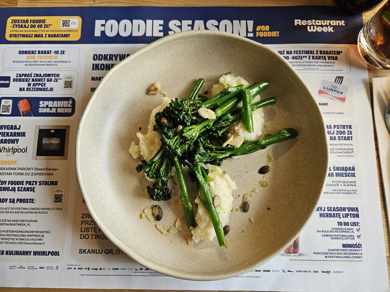 Menu B oferowało w pełni roślinną alternatywę. Smażony brokuł Bimi podany na purée z pietruszki na mleku kokosowym z dodatkiem orzechów i oleju crispy chilli to odkrycie tego sezonu! Wyróżniał się delikatnością smaków i orzechową nutą, dzięki czemu na pierwszy plan wysunął się naturalny smak warzywa.