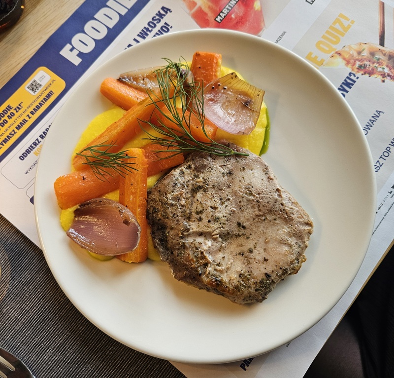 Danie główne, czyli schab z kością podany z purée z kukurydzy, marchewką, szalotką roscoff i oliwą chilli, stanowiło klasyczne połączenie smaków w nowoczesnej formie. Całość była naprawdę smaczna.