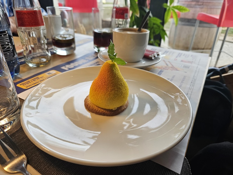 Deser w postaci musu waniliowego z karmelizowanymi gruszkami na kruchym ciastku sablé był lekkim i przyjemnym zakończeniem posiłku.