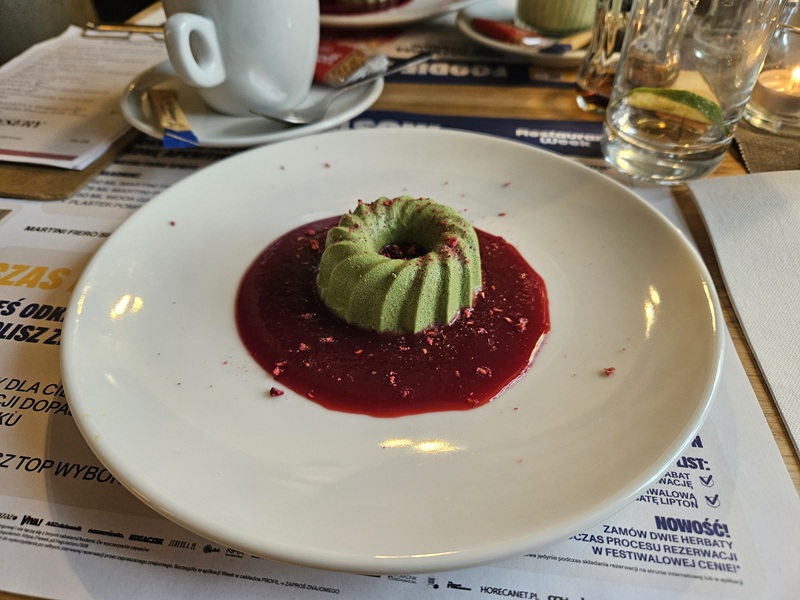 Deser, czyli wegańska panna cotta matcha z musem malinowym, był delikatny z dobrze wyczuwalnym smakiem matchy, choć mógłby zyskać, gdyby był nieco słodszy, co lepiej podkreśliłoby jego deserowy charakter.