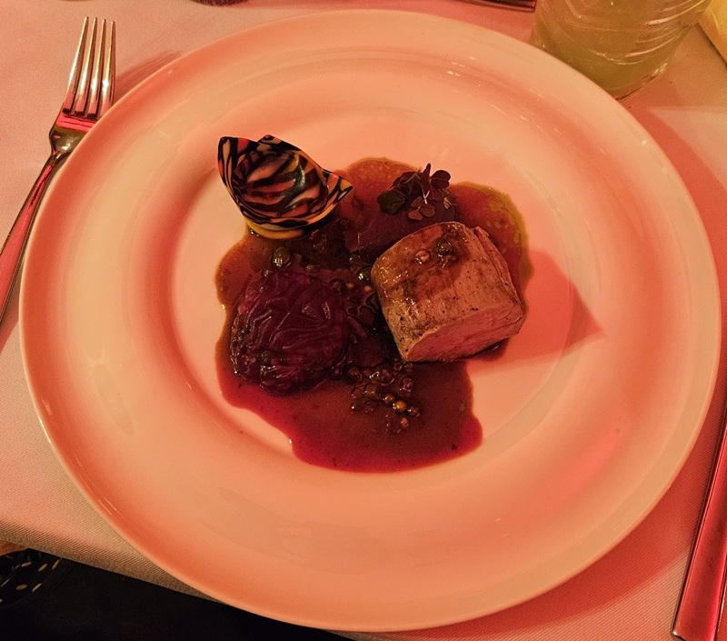 Następnie przyszedł czas na danie główne mięsne, które wyserwował gospodarz kolacji i Excecutive Chef Restauracji Salt w Copernicus Toruń Hotel - Dawid Wojciechowski. Polędwica cielęca w towarzystwie cappelletti z nerkami cielęcymi z dodatkiem czerwonej kapusty i burakiem to klasyk, ale nie zabrakło kreatywności - buraczki zostały podane w formie... mózgu. Sos pieprzowy z kaparami dodał intensywności, która przyjemnie drażniła podniebienie.
